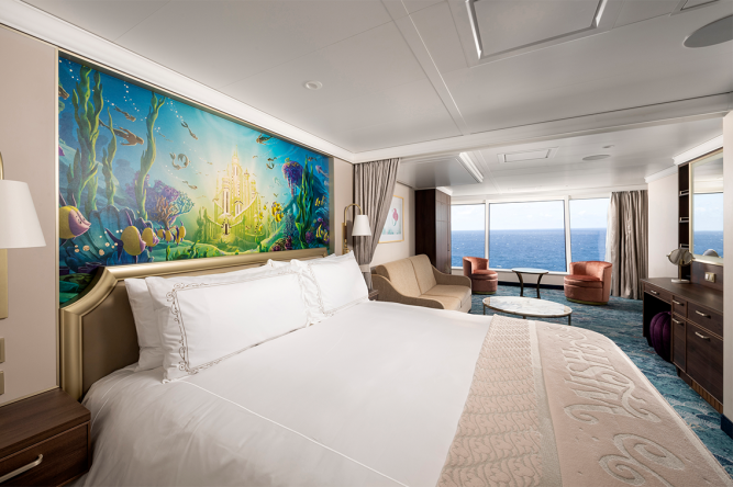 Les histoires Disney s’élancent vers de nouveaux sommets dans nos cabines concierge avec vue sur la mer, où vous pouvez séjourner dans votre propre espace inspiré de Raiponce ou vous reposer dans un des sept espaces sur le thème de La Petite Sirène qui comprennent notre toute première vue face à l’avant. Des détails extravagants et des commodités de première classe inspirées de l’élégance classique de La Belle au bois dormant abondent dans nos suites royales enchanteresses; dont deux s’étendent sur deux niveaux avec un escalier en colimaçon et des vitraux. C’est un accueil royal qu’ils n’oublieront jamais!