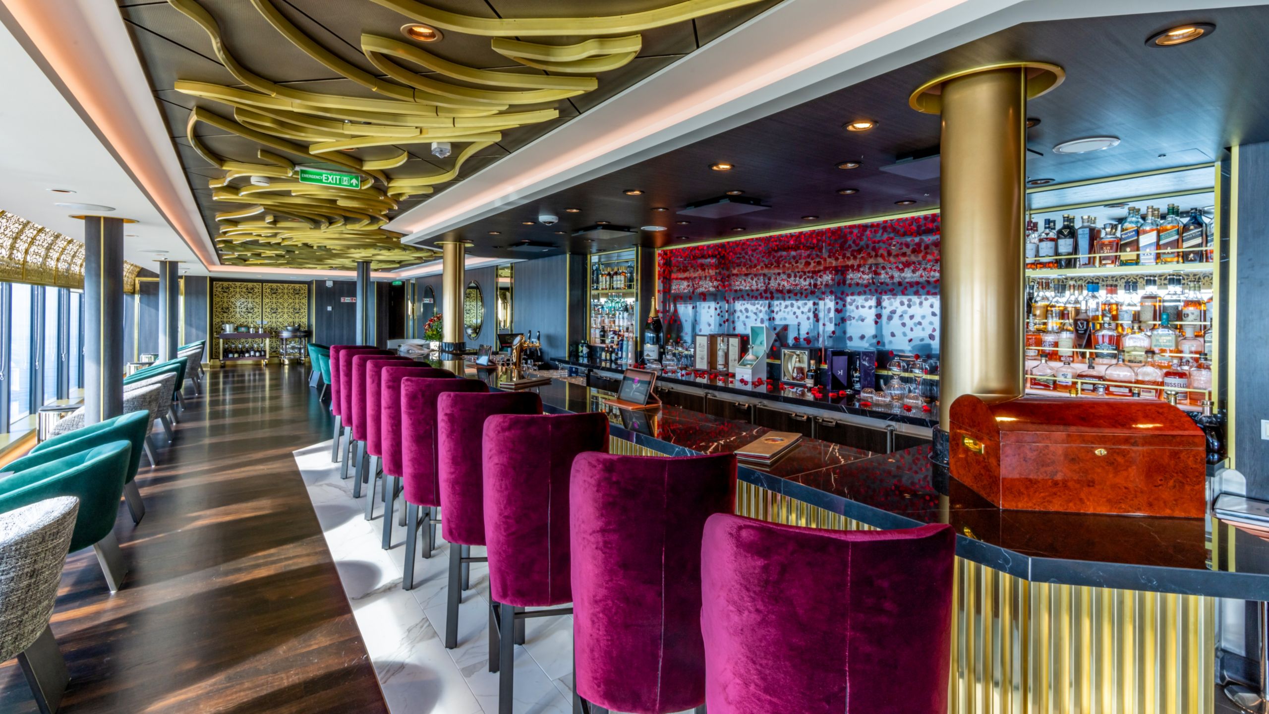 Representação de hóspedes desfrutando de bebidas e socializando no lounge Skipper Society